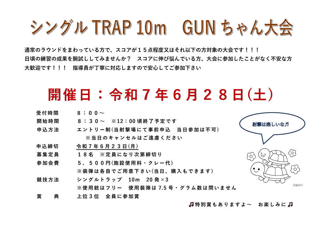 6月28日(土)シングルTRAP(10m)GUNちゃん大会のご案内(5/21現在) 2025年05月14日 平素は弊射撃場をご愛顧いただき誠にありがとうございます。さて、今回は通常のTRAPのラウンドの経験者で、猟銃を所持されてから1度も大会に参加されたことがない方、上手な方々と一緒に撃つことが不安な方、スコアが15枚程度、またはそれ以下の方を対象に、大会の回り方を練習していただいたり、同じくらいの実力の方との懇親の場も兼ねて、射撃大会を開催いたします。※あと、お一人様で定員となります。 < 前の記事次の記事 >
